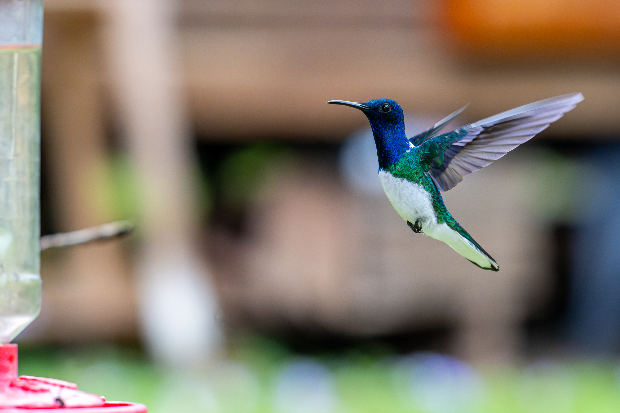 The butterfly farm also has feeders out and they’re visited by around a dozen species of hummingbirds. The most numerous are these white-necked jacobins