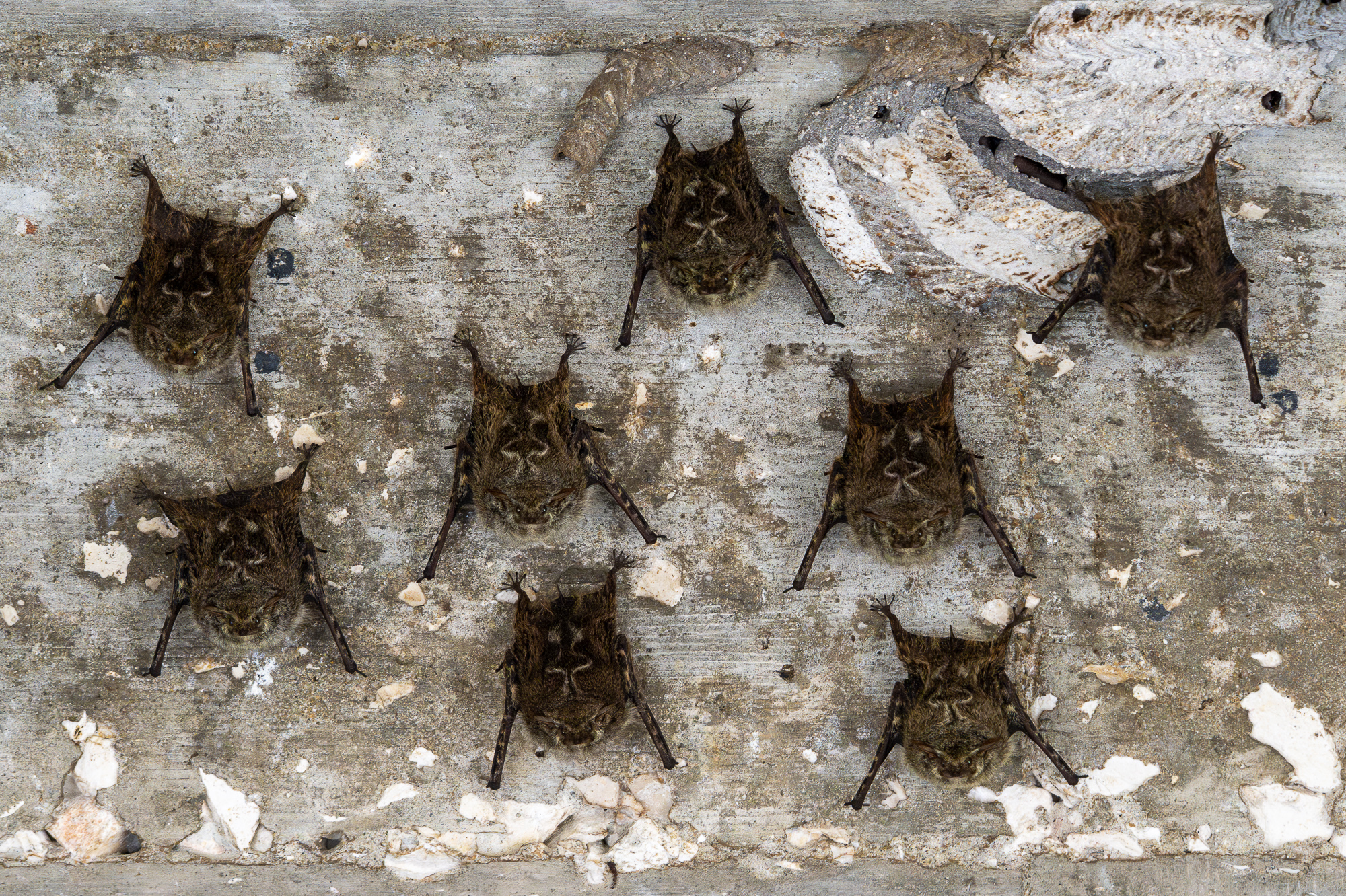 Proboscis bats clinging to the bottom of a bridge over the New River
