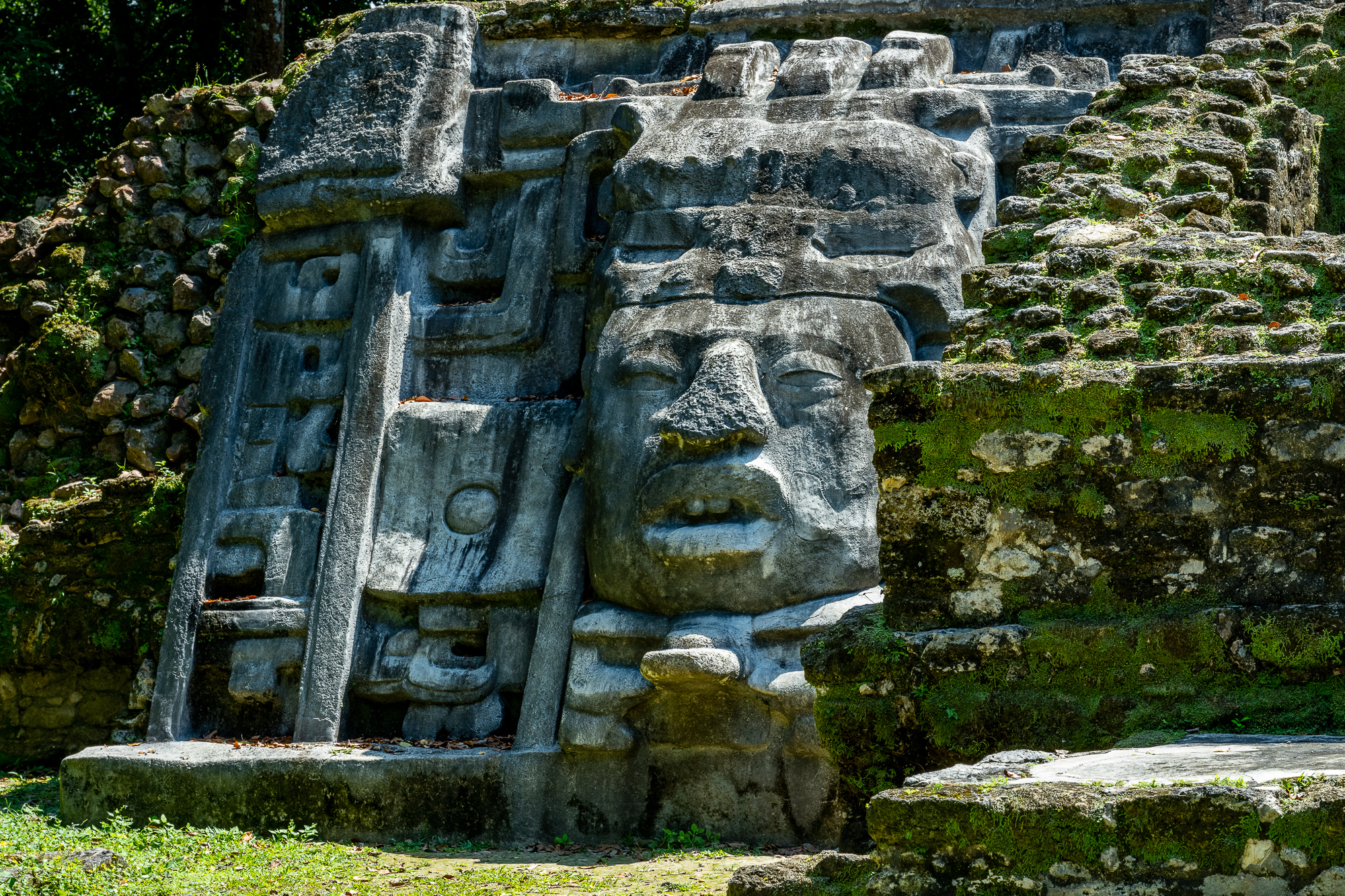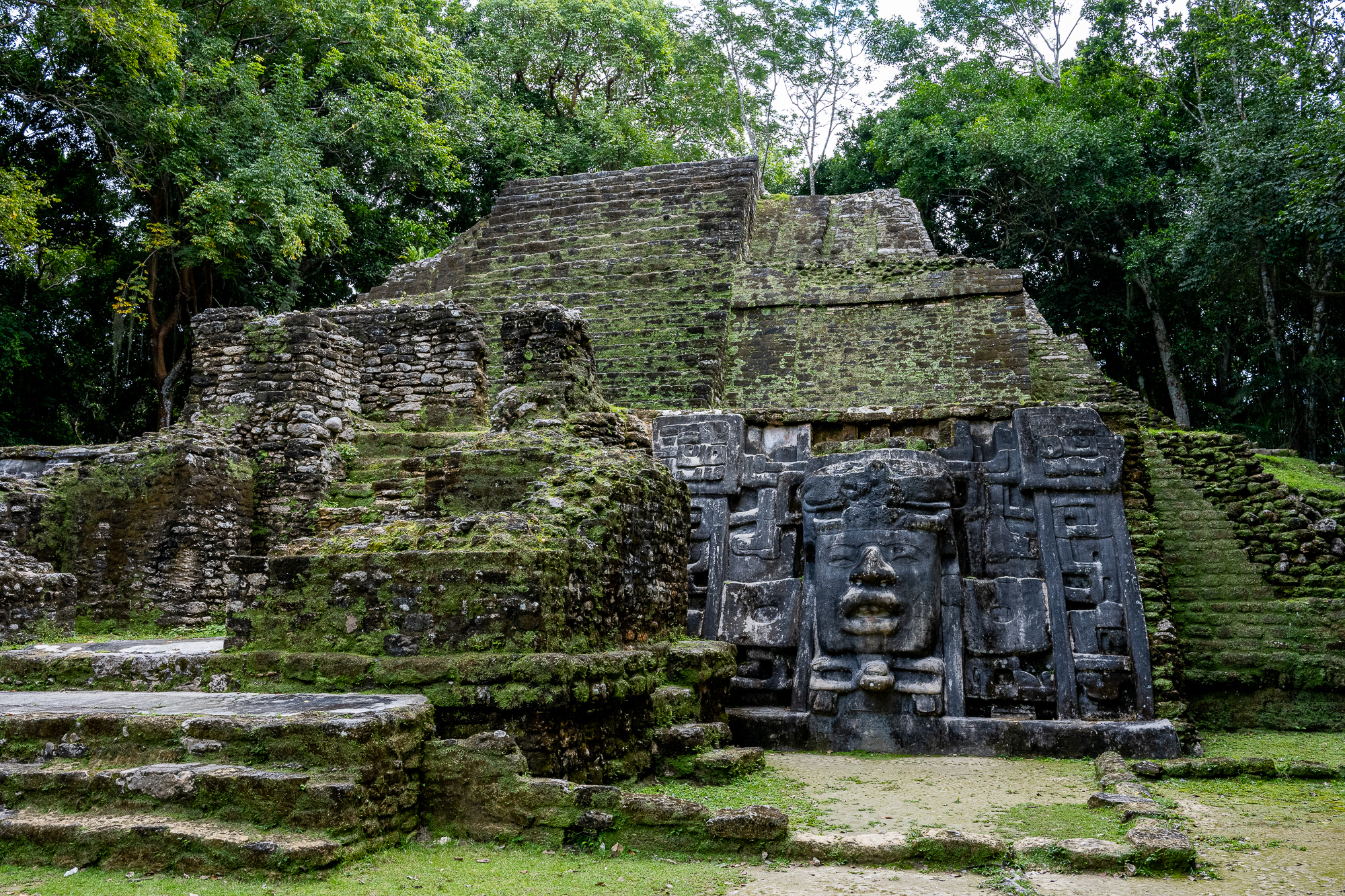 The Mask Temple at the Mayan ruins of Lamanai. The original masks have been removed for safe-keeping against the elements – this building now has a replica installed