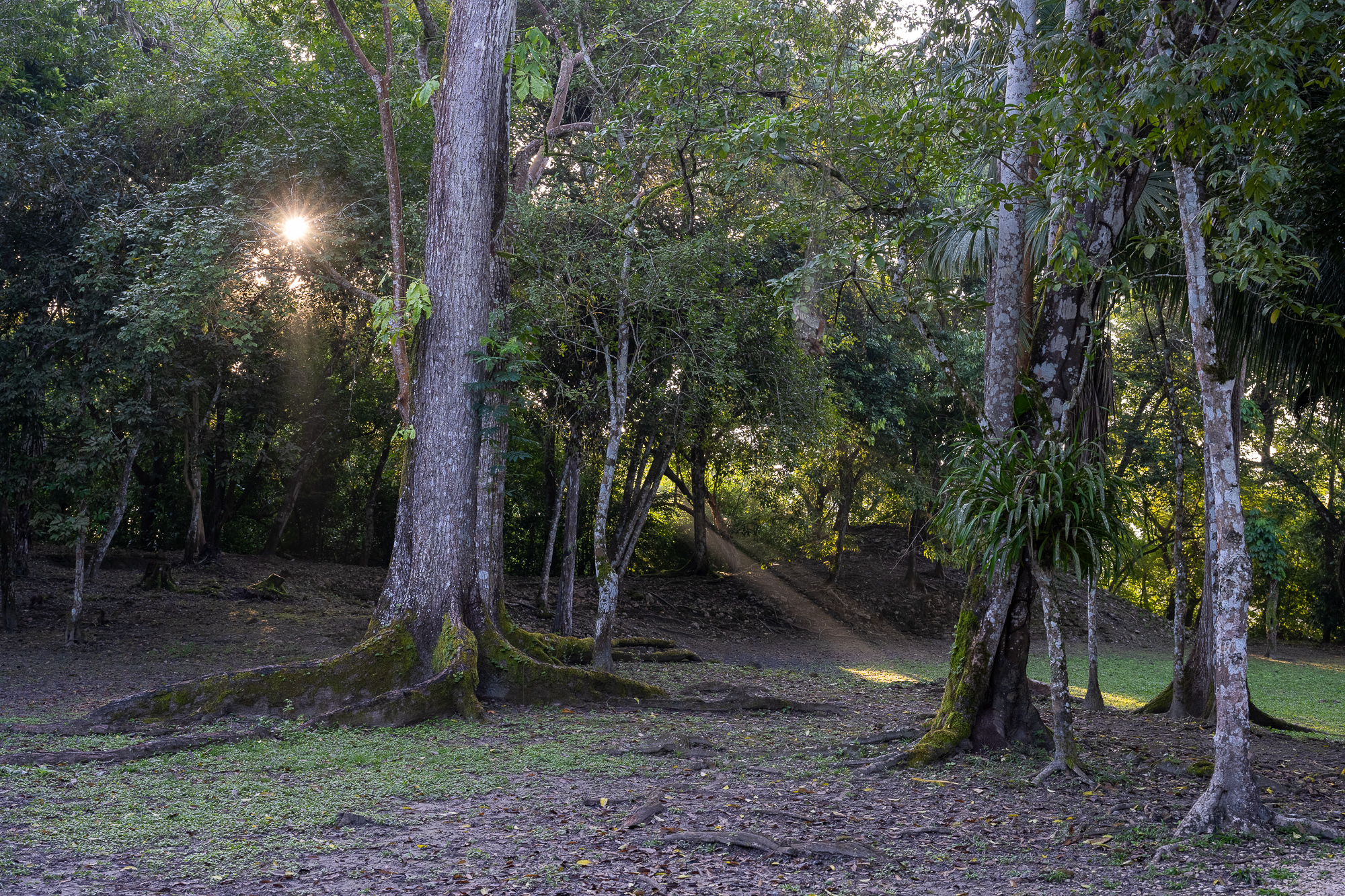 A lone ray of sun bursts through the jungle at Cahal Pech.