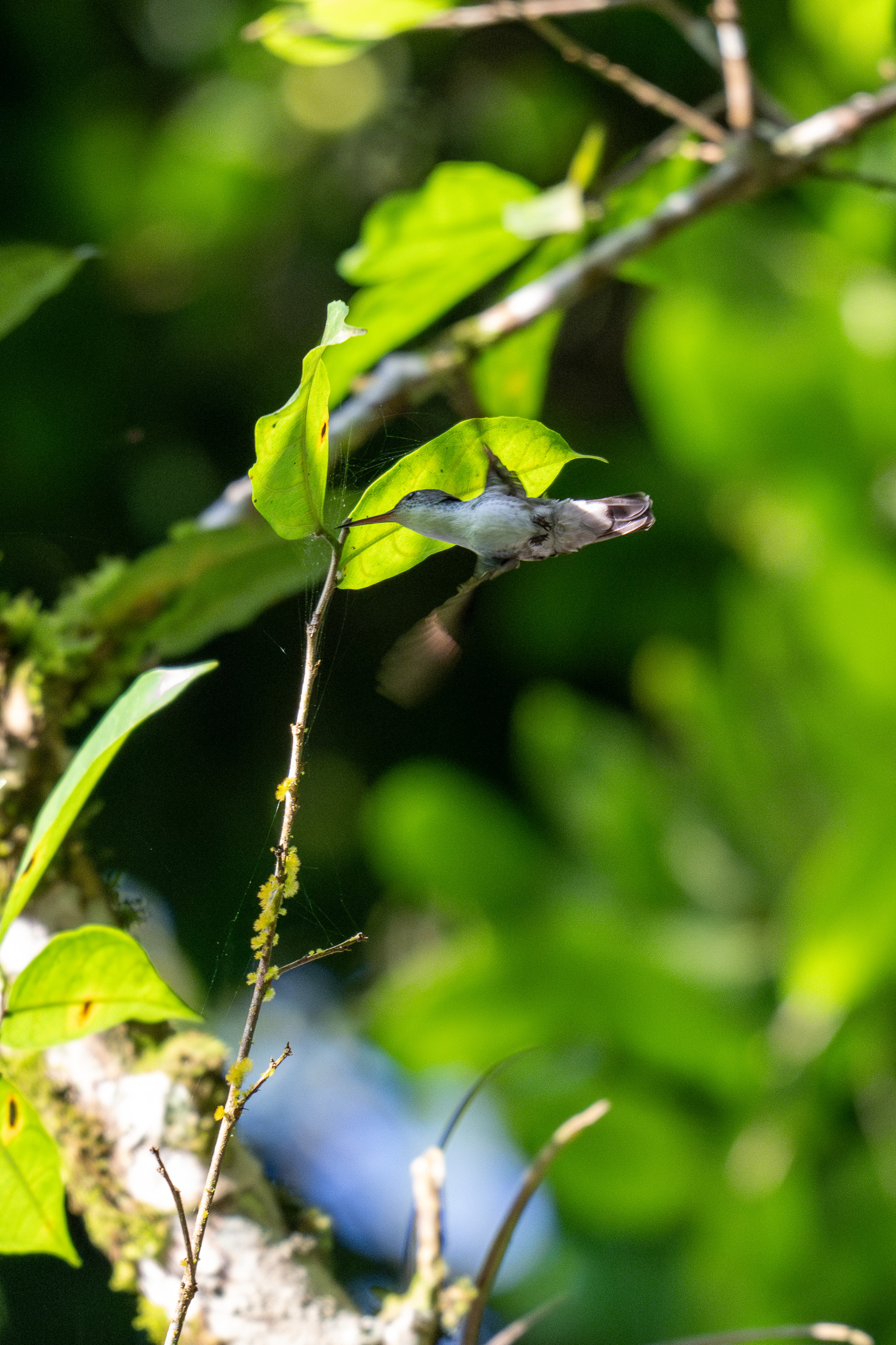 A white-bellied emerald hummingbird zips around a spiderweb above me
