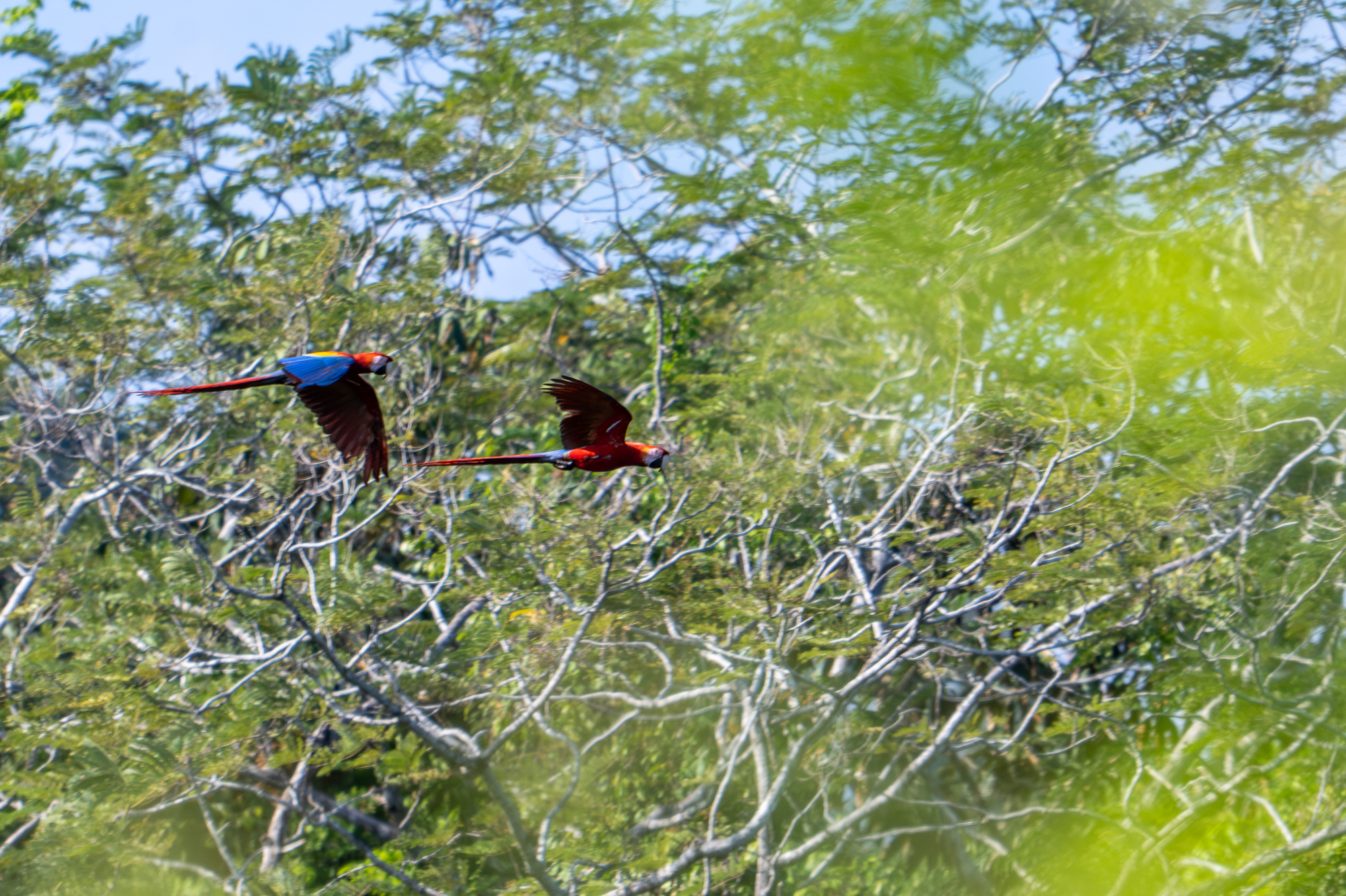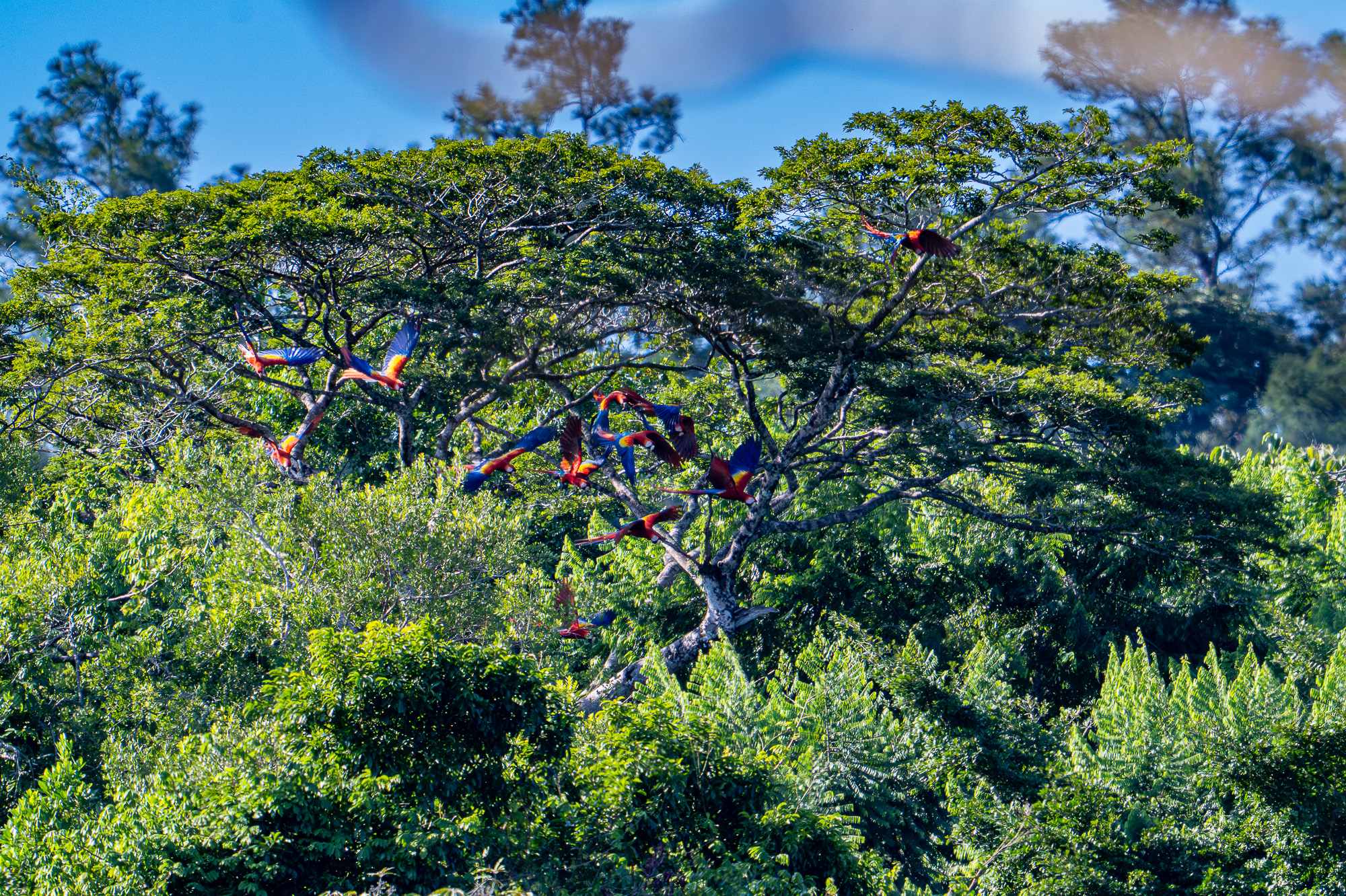 A large flock of scarlet macaws takes off in a burst of colour. We were quite distant from these birds but you could hear their cacophony from a distance.