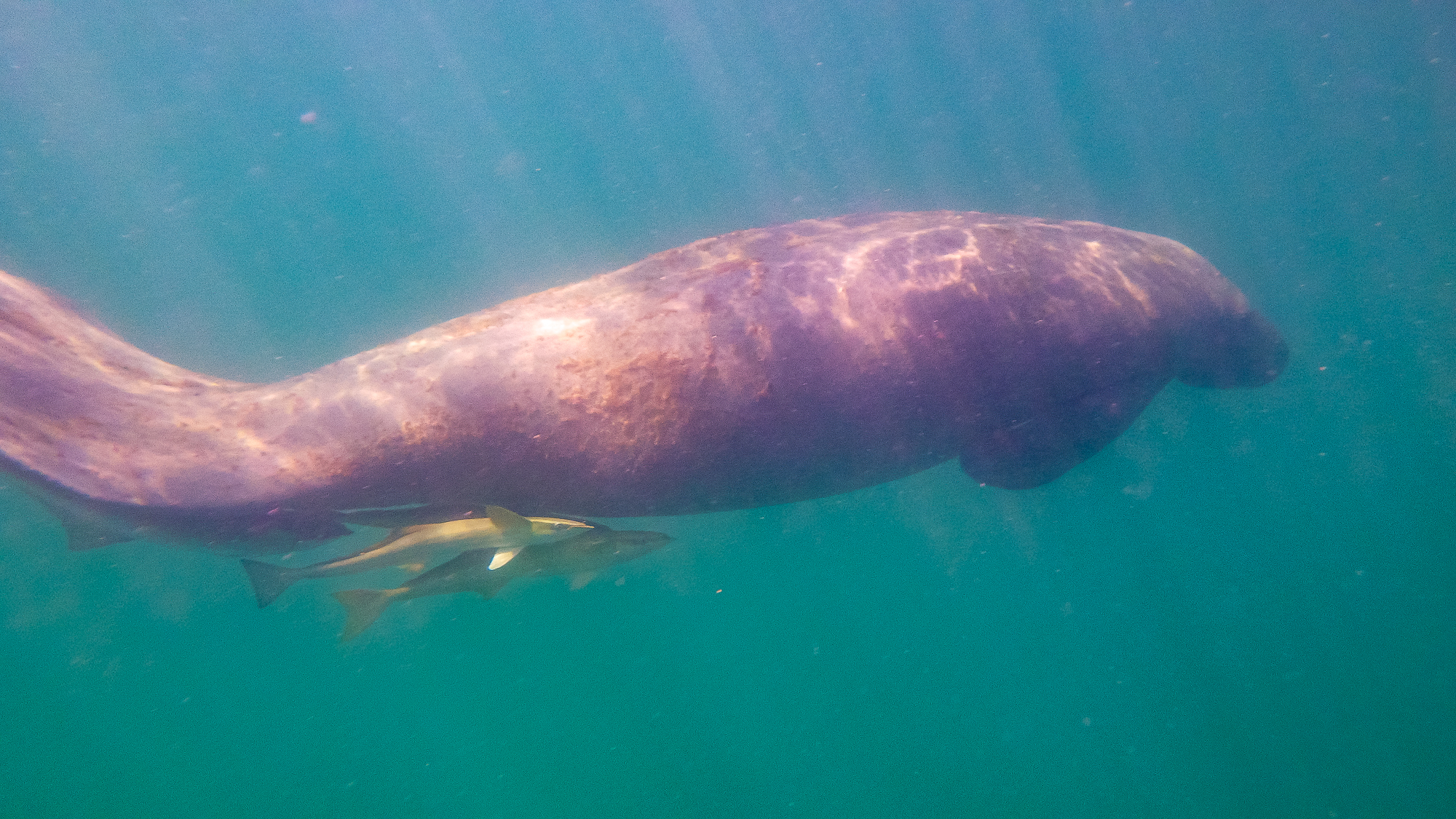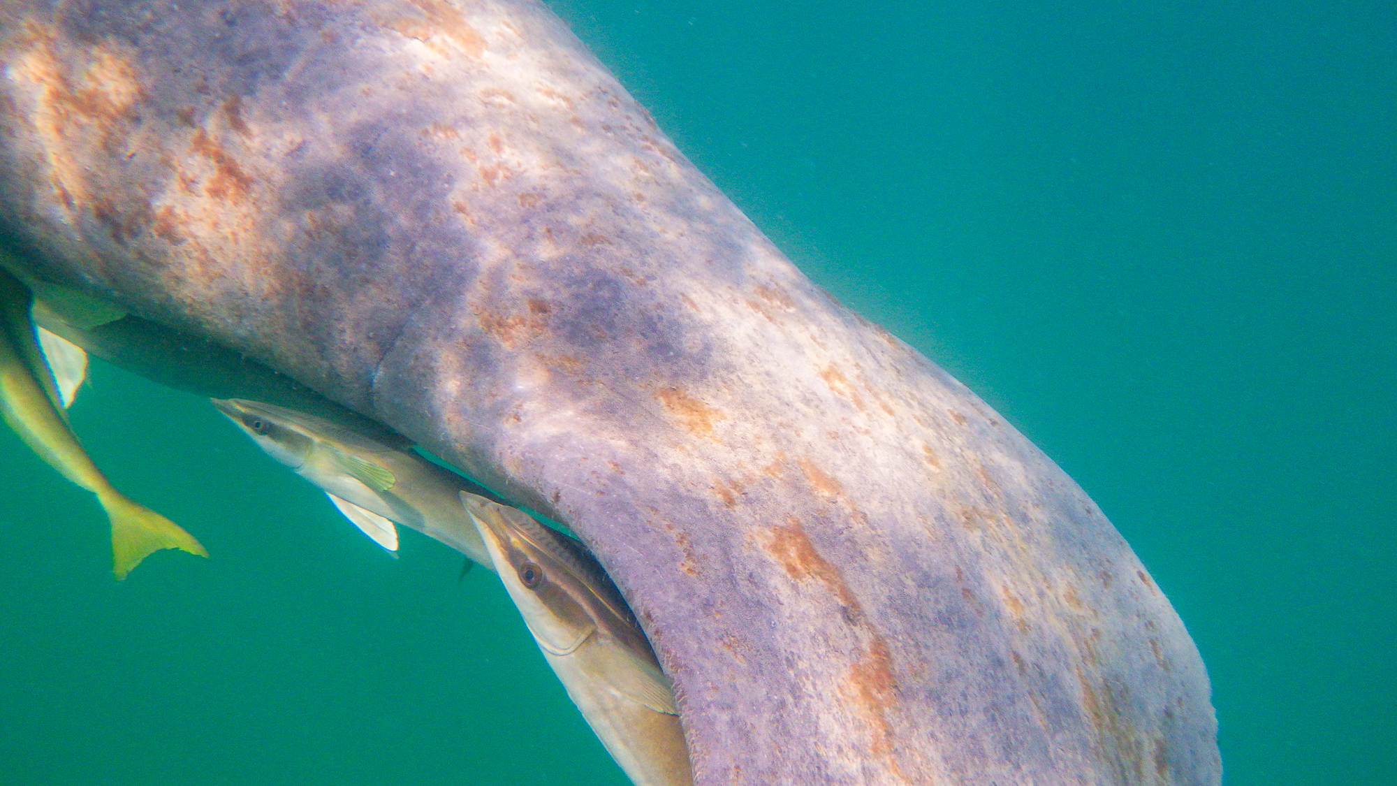 Common remora or suckerfish taking advantage of the shelter provided by the manatee’s tail