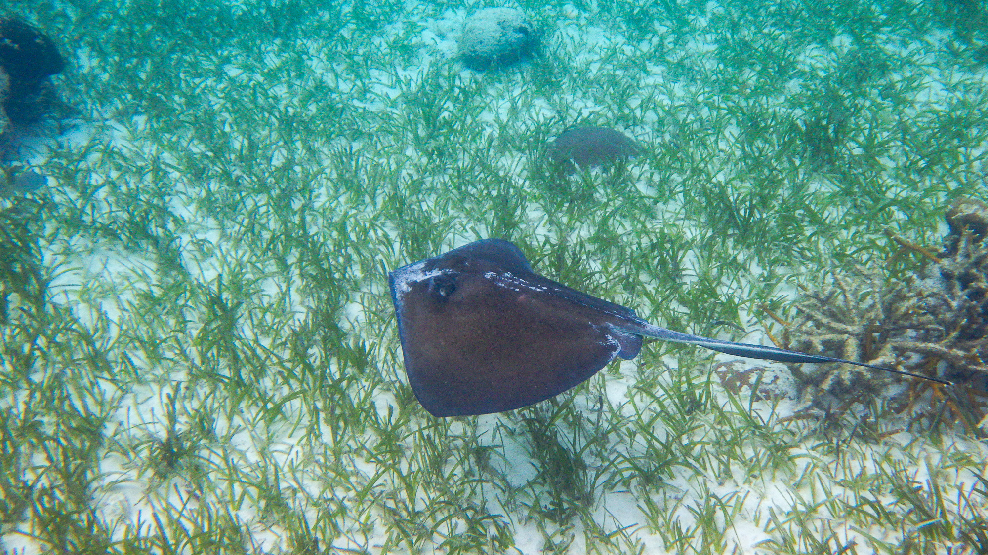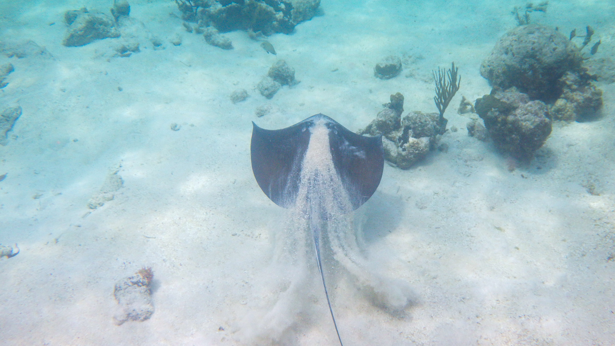A southern stingray takes off, shaking the sand off him as he climbs off the ocean floor