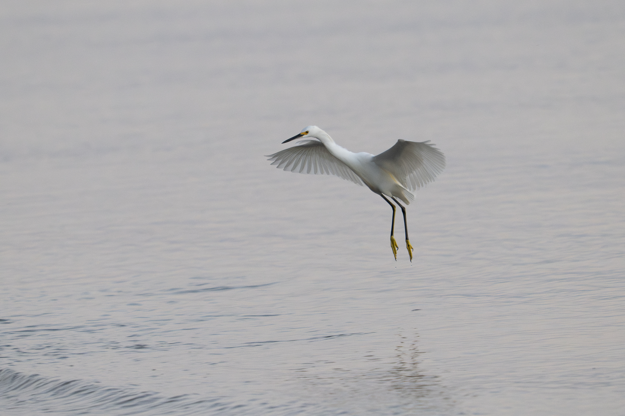 A snowy egret with the landing gear down