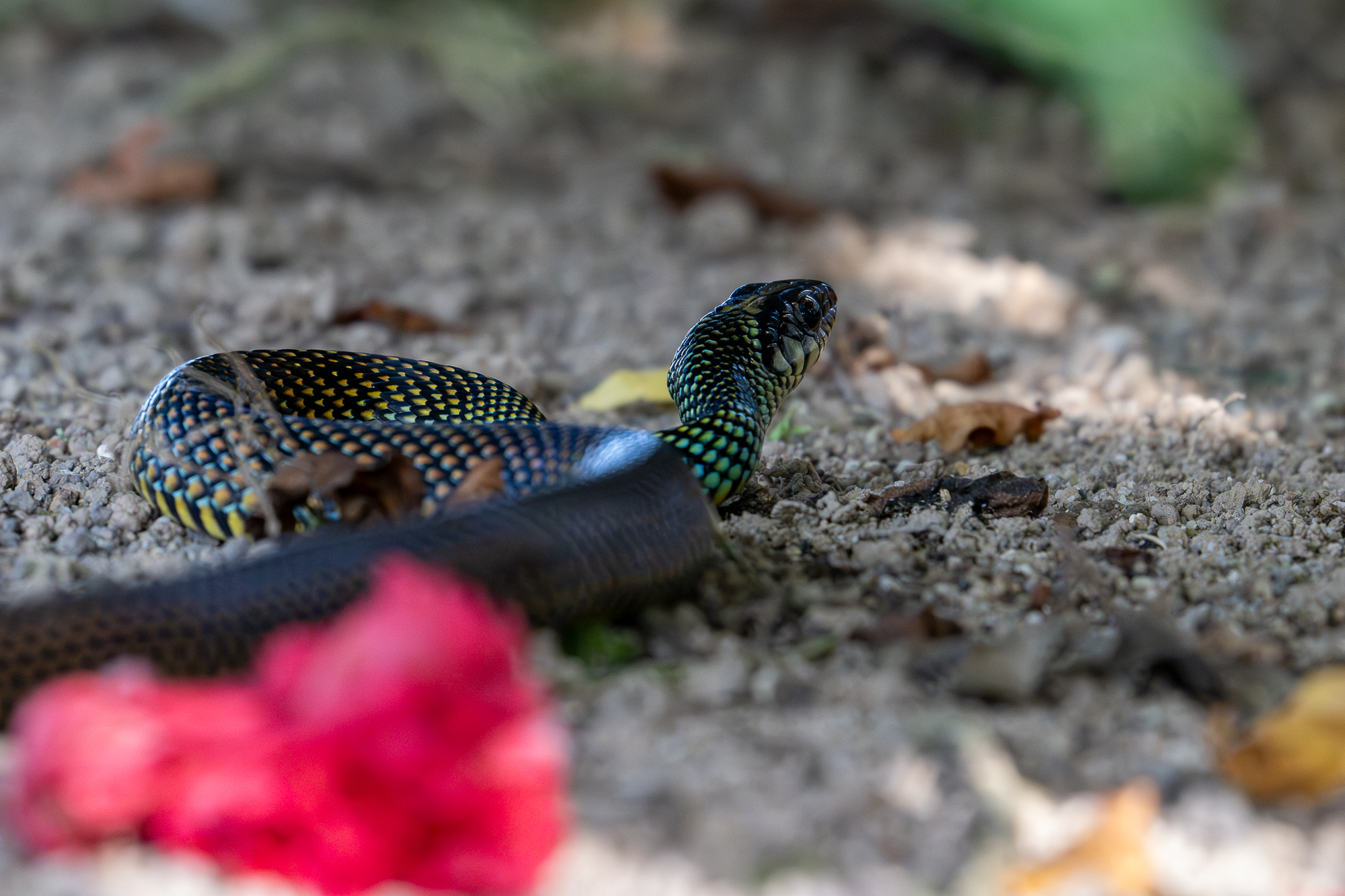 A speckled racer near the pool at our hotel. Non-venomous, these snakes are so named because of their speed and agility.